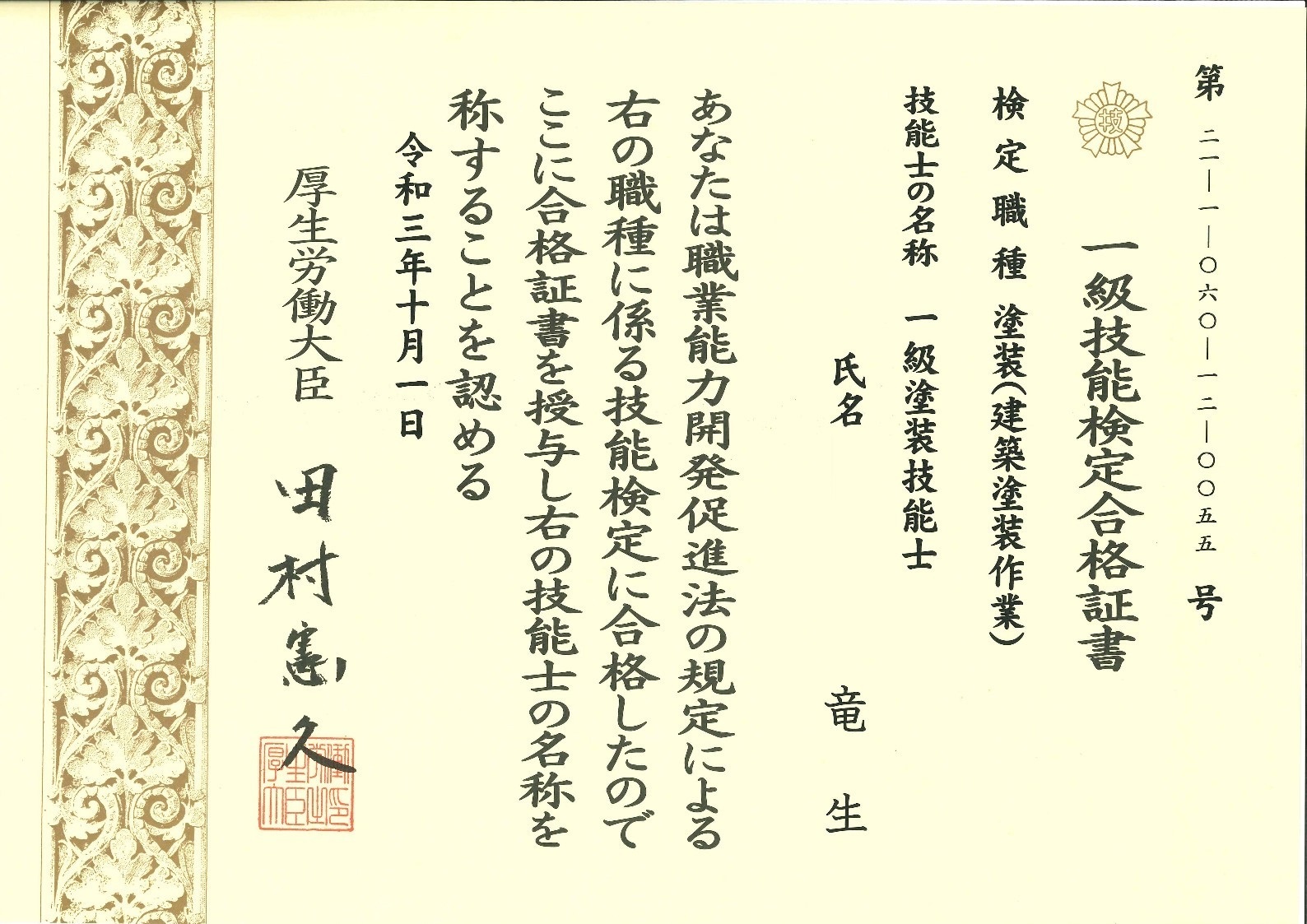 | 建設業許可 | 千葉県知事建設業許可 54901号 塗装工事業 大工工事業 石工事業 タイル・れんが・ブロック工事業 ガラス工事業 内装仕上工事業 建具工事業 左官工事業 屋根工事業 板金工事業 防水工事業 熱絶縁工事業 |